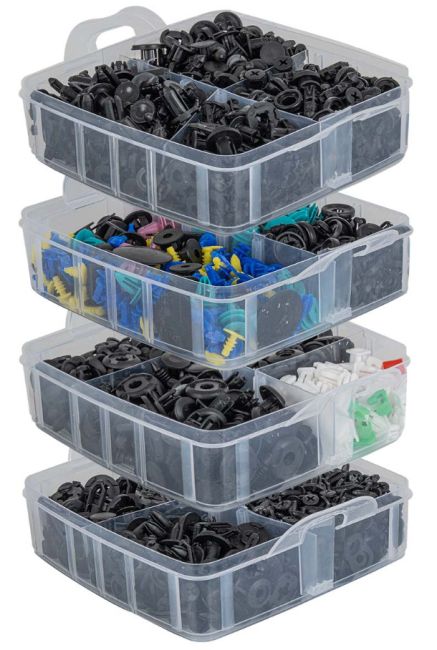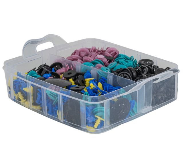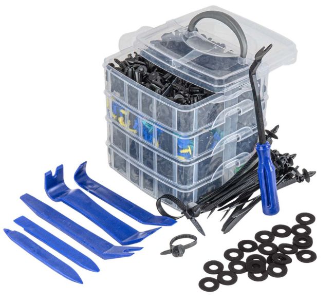 Laaja ja ammattitason 1211-osainen muovikiinnikesarja, joka sisältää korikiinnikkeitä, muoviniittejä sekä tarvittavat asennus- ja irrotustyökalut. Sarja mahdollistaa nopean, siistin ja turvallisen korinosien, listojen ja muovisuojien kiinnityksen sekä purkamisen.